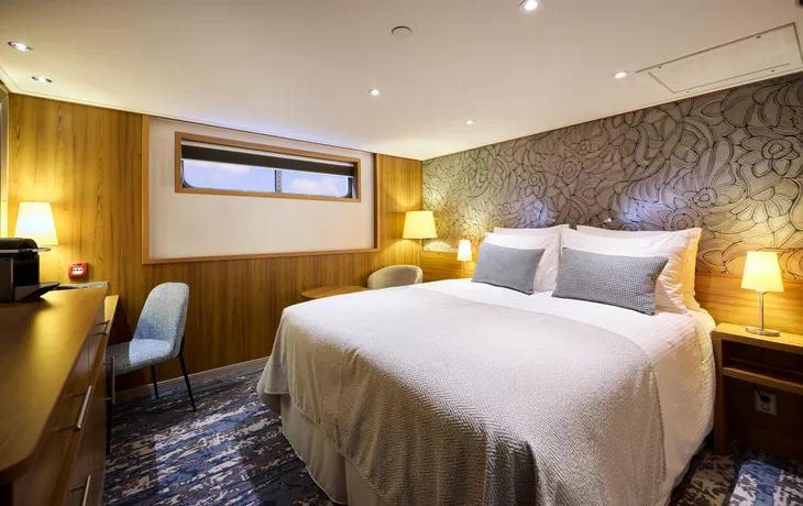 Die ca. 16 m² grossen 2-Bettkabinen des Mittel- bzw. Oberdecks verfügen über einen französischen Balkon mit raumhohen Glasschiebetüren.