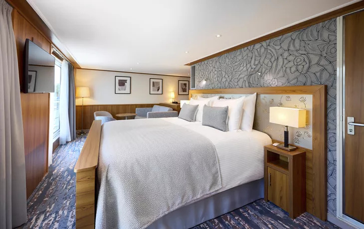 Die 1-Bettkabine auf dem Oberdeck, verfügt ber einen französischen Balkon mit raumhohen Glasschiebetüren mit einer Grösse von ca. 11 m².