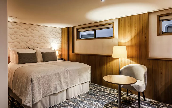Alle 2-Bettkabinen (ca. 16 m²), 1-Bettkabinen (ca. 11 m²), Suiten (ca. 24 m²) und die Master Suite (ca. 32 m²) liegen aussen, sind komfortabel und stilvoll eingerichtet. Auf dem Mittel- und Oberdeck mit französischem Balkon, auf dem Hauptdeck sind die kleineren Fenster aus Sicherheitsgründen nicht zu öffnen. Alle Kabinen sind mit Dusche/WC, Föhn, Kühlschrank, Nespressomaschine, Safe, TV/Radio und individuell regulierbarer Klimaanlage ausgestattet. Die Suiten verfügen über ein zusätzliches Sofa und eine Badewanne anstelle der Dusche. Die Master Suite ist mit einem zusätzlichen Sofa und separater Badewanne ausgestattet.